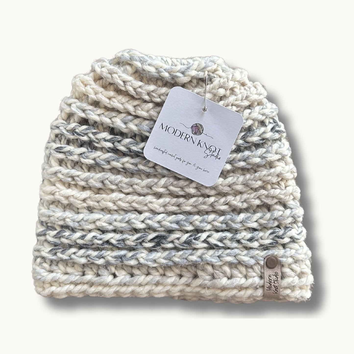 This hand-crocheted beanie is a perfect blend of comfort and style. The textured stitch gives it a unique look. It's soft, warm, and great for keeping cozy during the colder months while able to wear a messy bun or ponytail.